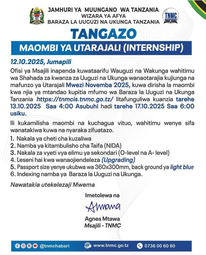 Are you a recent graduate in Nursing or Midwifery? The Tanzania Nursing and Midwifery Council (TNMC) has officially opened applications for the November 2025 Internship Program. This is a crucial opportunity for all qualified nurses and midwives holding a first degree in Nursing or Midwifery who are ready to begin their professional journey through internship training, Tanzania Nursing Council (TNMC) Internship 2025,